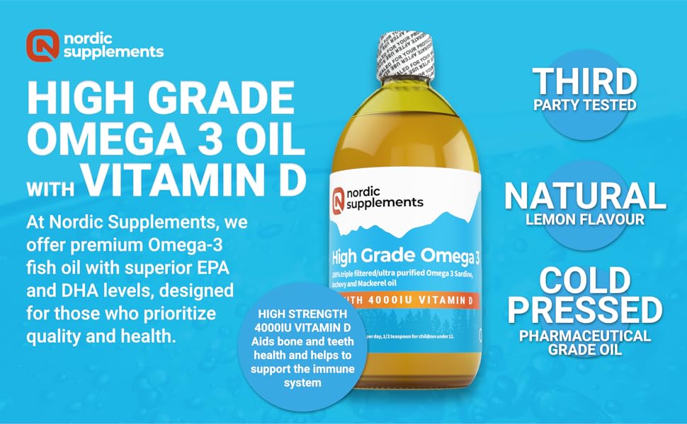 Nordic Supplements' High Strength Omega 3 Fish Oil offers a potent 500ml supply enriched with 1000IU of Vitamin D3, sustainably sourced for your health and the environment. Enjoy the award-winning lemon flavor while supporting your immune system and bone health, all backed by a 30-day money-back guarantee.